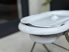 ホーローの柔らかな光沢と、アイアンスタンドの無骨な風合いが絶妙に調和した美しい佇まい。