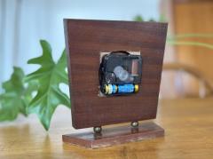 メーカーは不詳ですが木製のスクエアケースに真鍮の縁取り、シンプルなインデックスの文字盤が上品な印象。