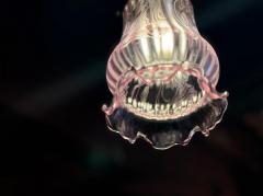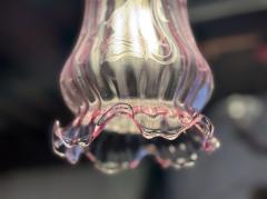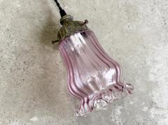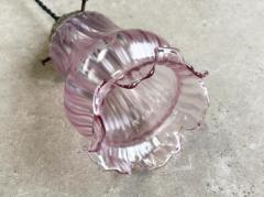 繊細なフリルのようなガラスシェードは、淡い紫色のグラデーションと波打つデザインが美しく、灯りをともすとやわらかな光が空間を包み込みます。