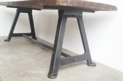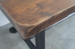 工業機械の脚に古材の天板を取り付けたテーブル。