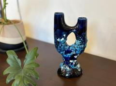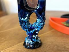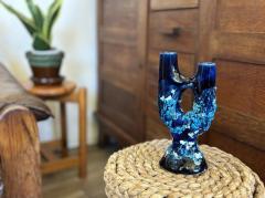 力強い造形と、溶岩のように流れる鮮やかなブルーとブラックの釉薬が印象的な、