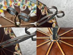 傘を広げたような優雅なフォルムのプレートに、中央から伸びるアイアンの支柱が取手代わりとなり、