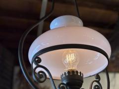 繊細な曲線を描くアイアンフレームに、柔らかな乳白色のガラスシェードを合わせ、