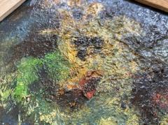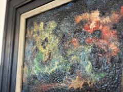 厚みのある絵の具のタッチによって立体感が生まれ、抽象的で奥行きのある世界観を感じさせます。