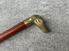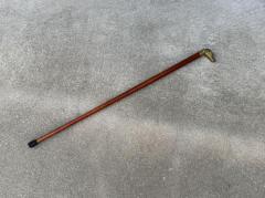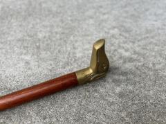 犬のモチーフになった真鍮製の持ち手を備え、長い年月を経た金属の深い艶と木部の風合いが