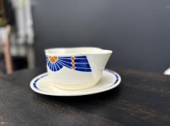現代的な感性にも響く大胆な幾何学模様と、クリーム色の陶胎に映えるコバルトブルーとオレンジ鮮やかなコントラストが特徴です。