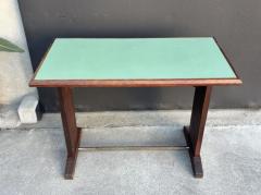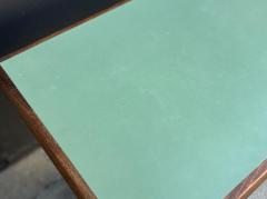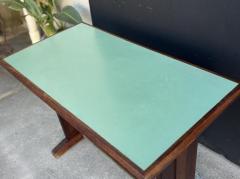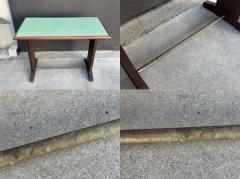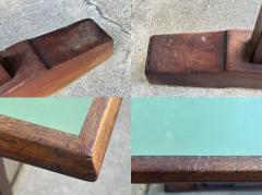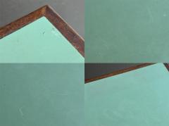 深みのある木味の脚部と、エメラルドグリーンの天板とのコントラストが印象的。