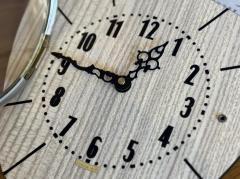 木目調のベースにブラックのラインが広がり、中央の真鍮フレームとクラシカルな針が