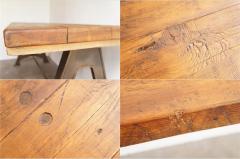 工業機械の脚に古材の天板を取り付けたテーブル。